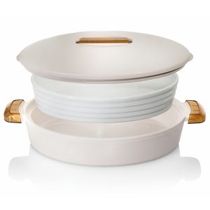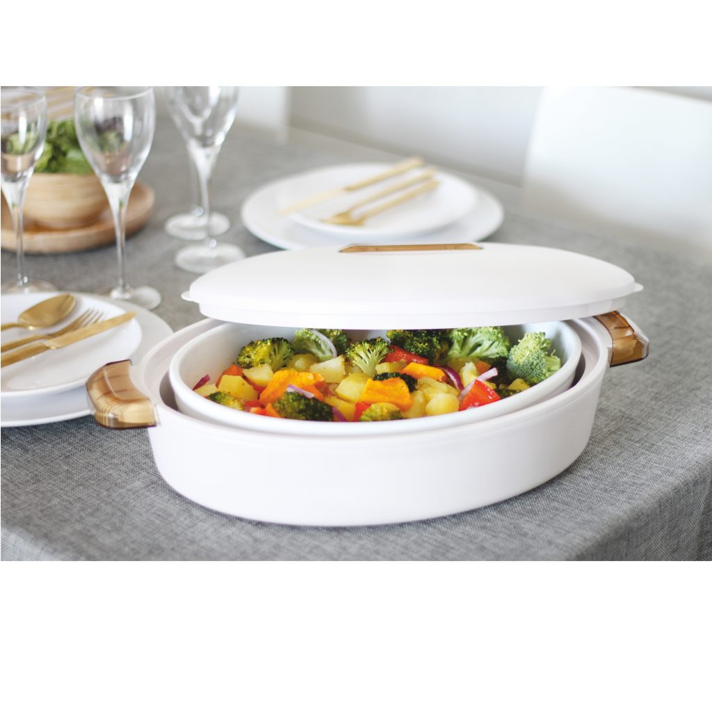 ظرف پخت سرامیکی سفید که می تواند برای پخت و پز در فر یا مایکروویو استفاده شود، باید برای حفظ دما، حمل و نقل و سرو روی میز در ظرف حرارتی قرار داده شود.